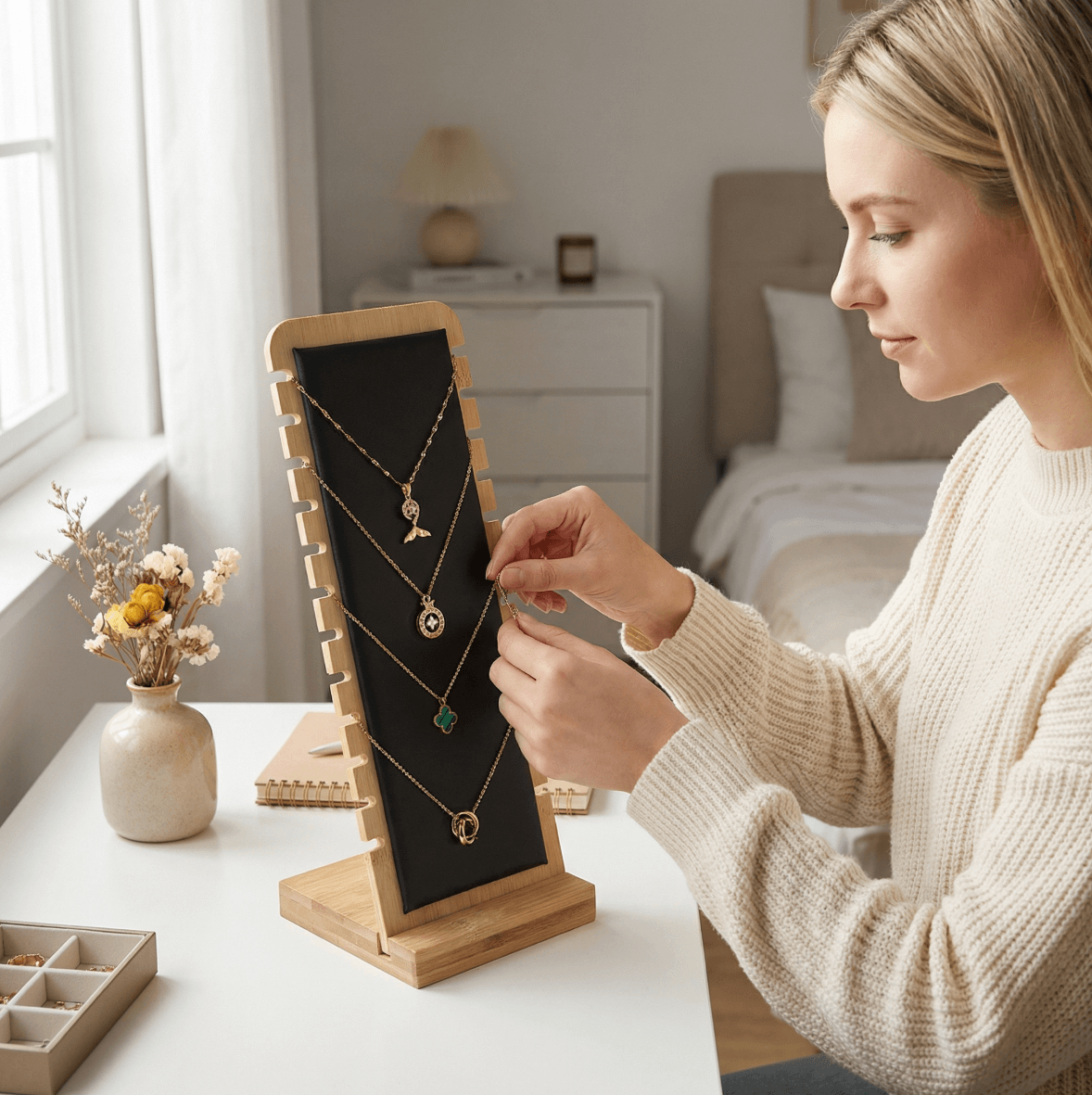 Imagine a clean, organised jewellery setup